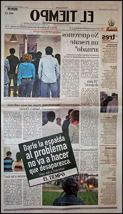 Capa de quarta-feira (06) do jornal colombiano El Tiempo. Totalmente invertida, exibindo fotos de pessoas de costas, a inteligente primeira página reflete a mensagem de protesto do periódico contra as Forças Armadas Revolucionárias da Colômbia (Farc).